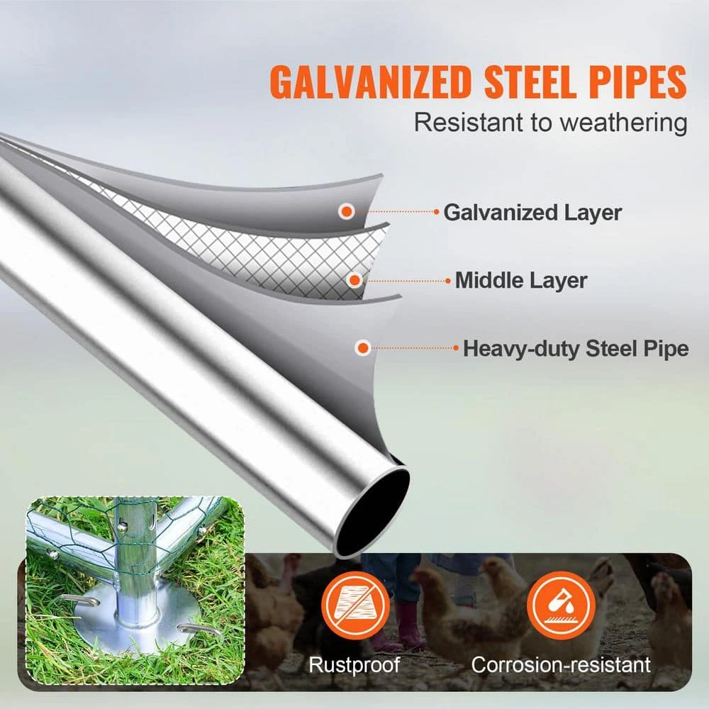 Secure Shelter for the Poultry. Our metal chicken coop is made of galvanized steel pipes, tested against salt spray to prevent rusting. It provides a safe and cozy high-quality home for your chickens, no matter rain or shine.