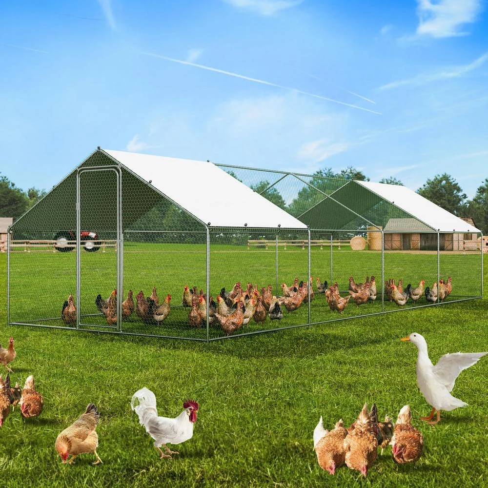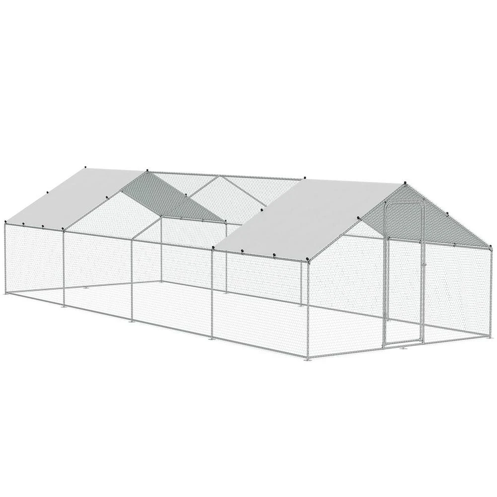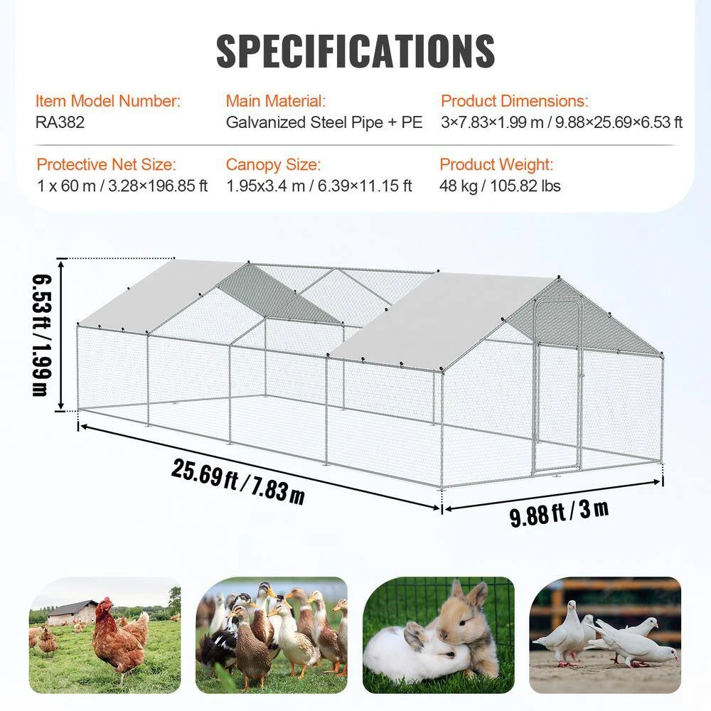- Spacious living area: offering a generous 3 x 7.83 x 1.99 m/9.88 x 25.69 x 6.53 ft. of space, this metal chicken run features 4-sided ventilation, creating a healthy and comfortable environment, the PE-coated canopy provides sun protection, waterproofing and tear resistance, shielding your poultry from external elements