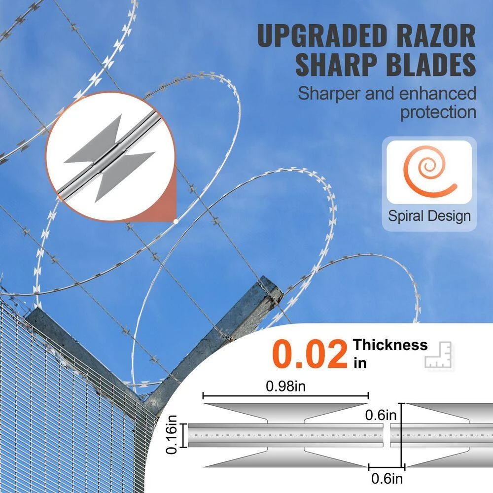 - Sharp razor blades: upgraded with razor blades measuring 0.02 in. thickness and 0.98 in. width, our razor barbed wire provides superior protection; the longer and sharper blades create a more menacing spiral, increasing security and preventing intrusions effectively
