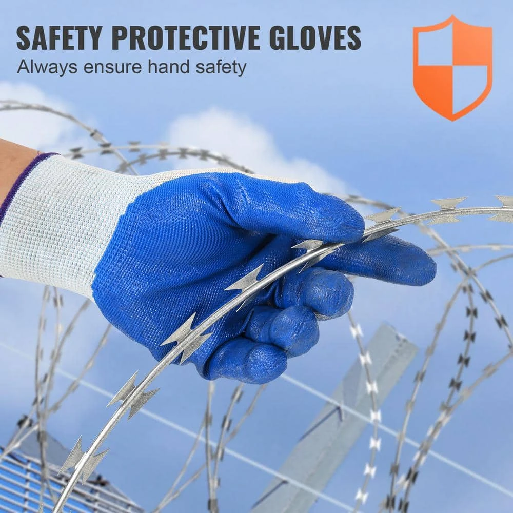 Long Coverage, Strong Defense with Razor Wire Protection. Our razor wire features high-strength hot-dip galvanizing, ensuring rust-proof features. With an extensive 98 ft. coverage, 0.02 in. sharp blades and 0.16 in. thick core wires, it provides outstanding double-spiral protection. Plus, it comes with protective gloves for injury-free installation.