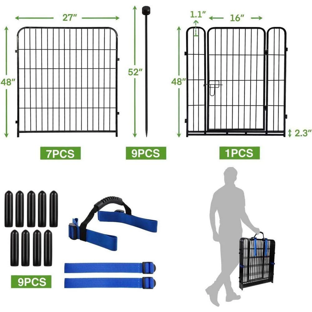 - This garden fence package includes seven 48-inch high, 27-inch wide panels, one door, nine connecting rods, small rubber covers, and carry straps, weighing a total of 40 pounds.